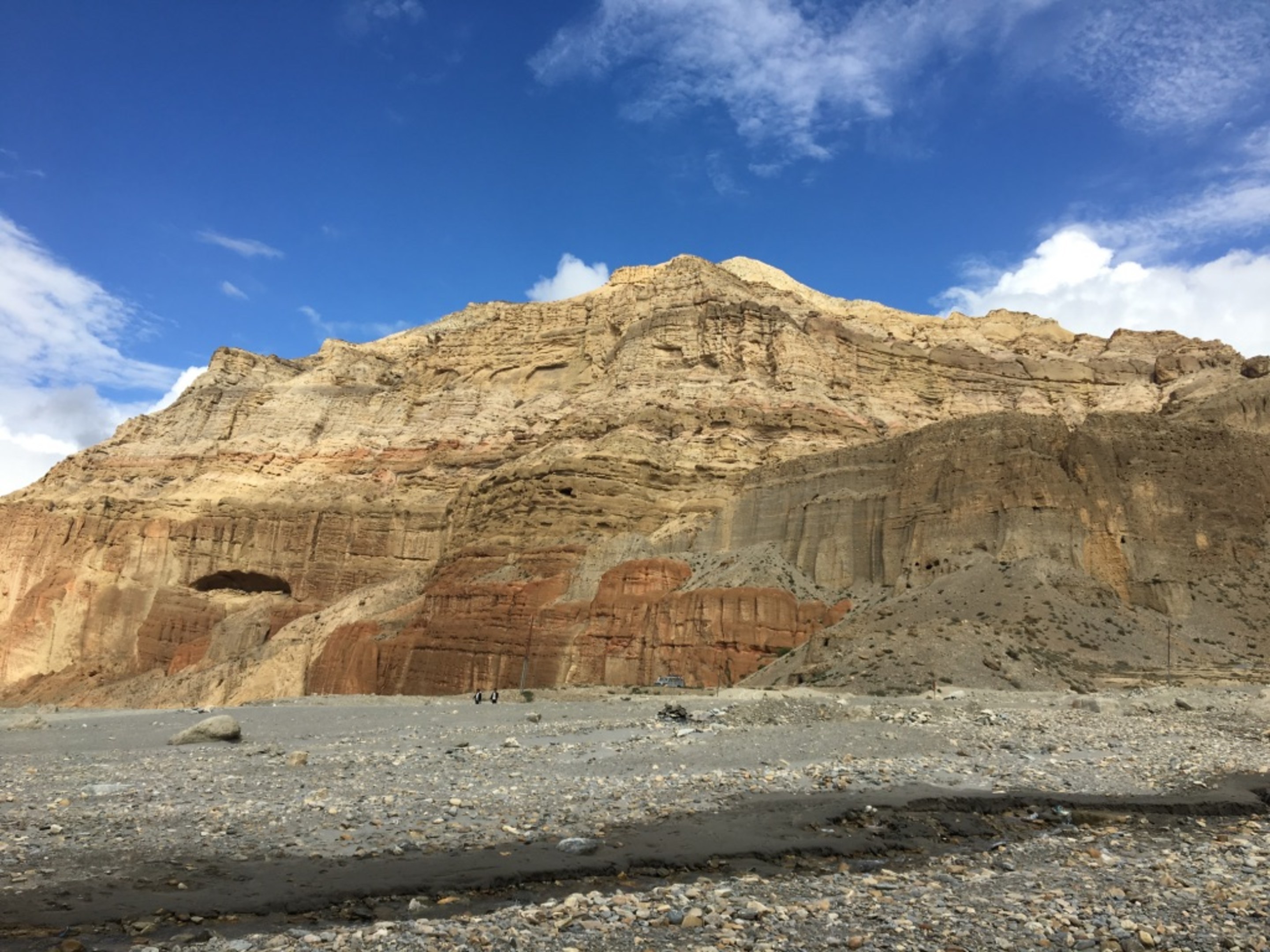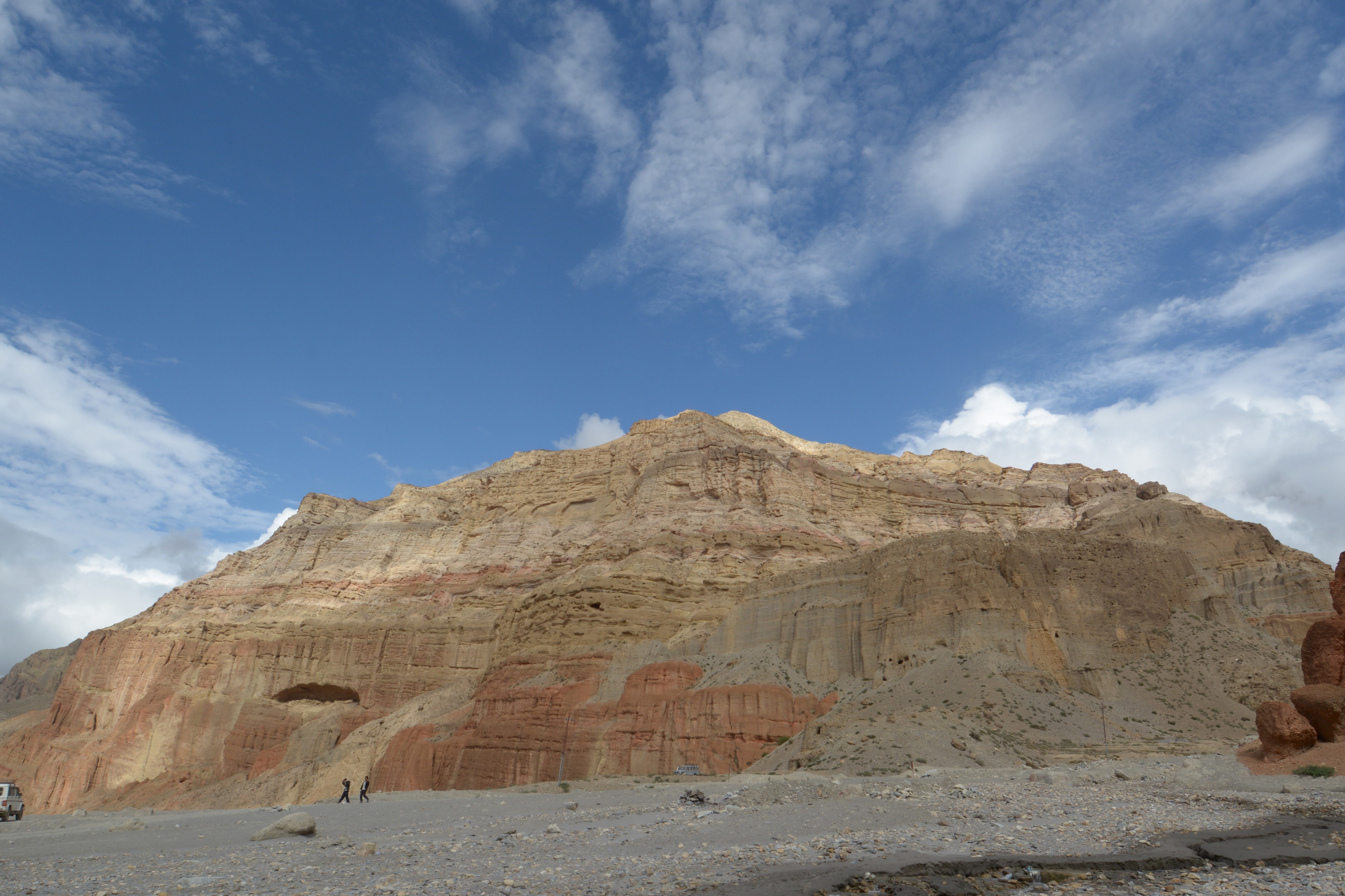 I saw this interesting geological feature from the face of a ten story hill that has been cleaved to make the road. Clay like deposits at the bottom, followed by rounded rocks(indicative of exposure to fast flowing water) and earth on top. You can see Chaile at the top of the slope(loose rocks slope it turns out) in the middle of the second picture. The picture with the 4x4's parked is where the Kali Gandaki river concentrates into a fast torrent going through a hill. It is also the start/end point for 4x4 transportation(the only kind of public transportation available really) going to different villages. You can see the hole in the hill a few pictures later.