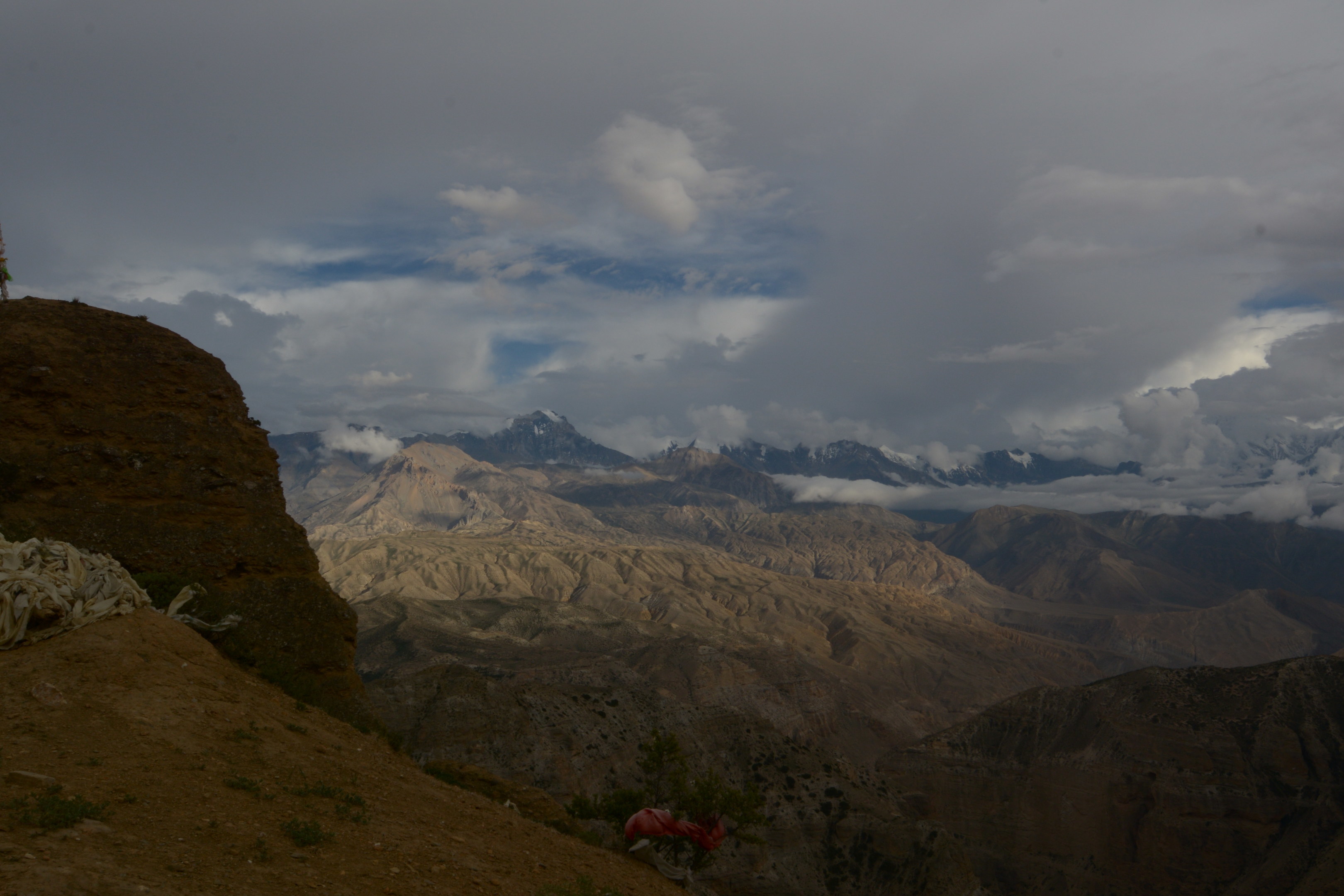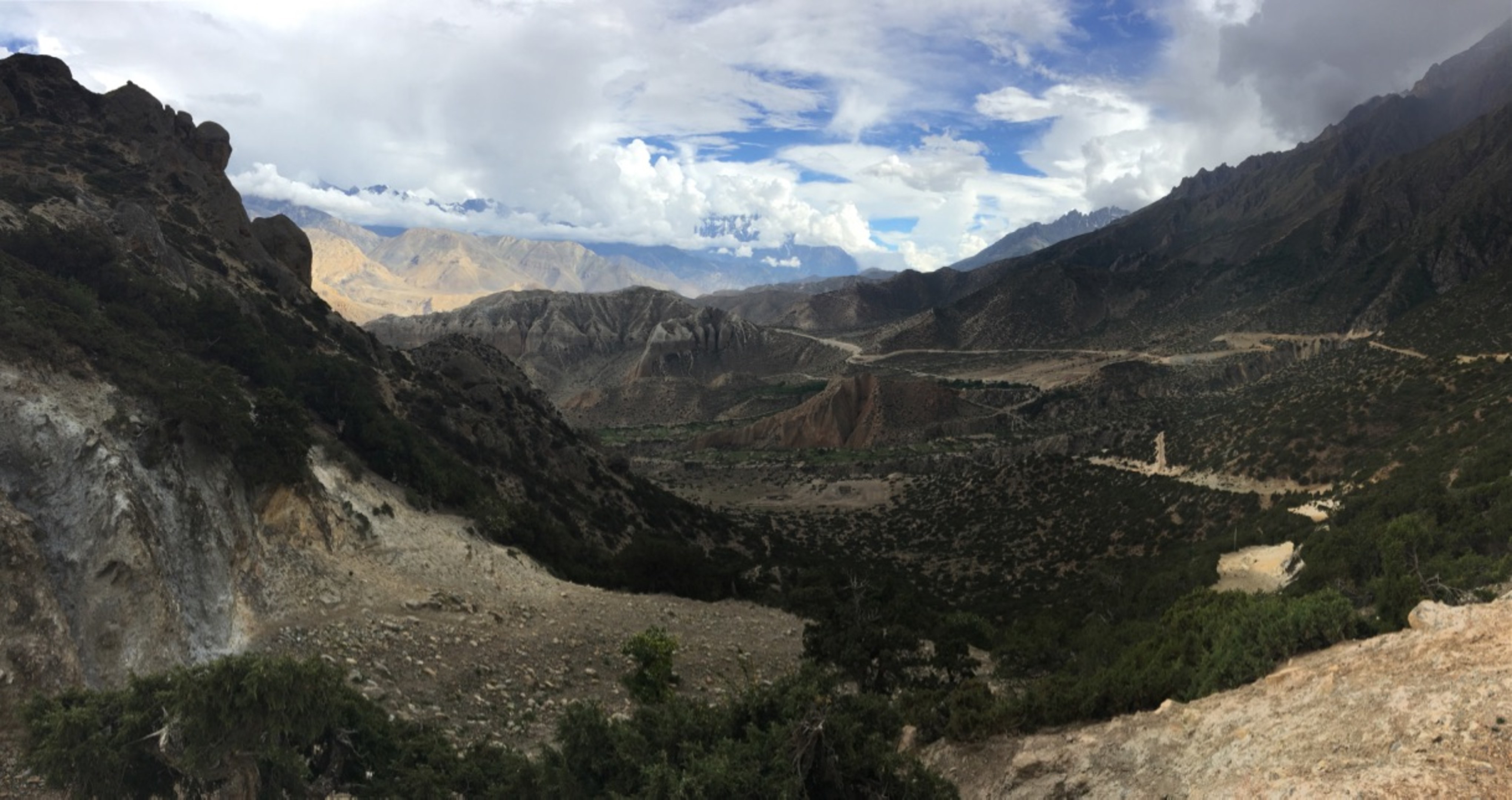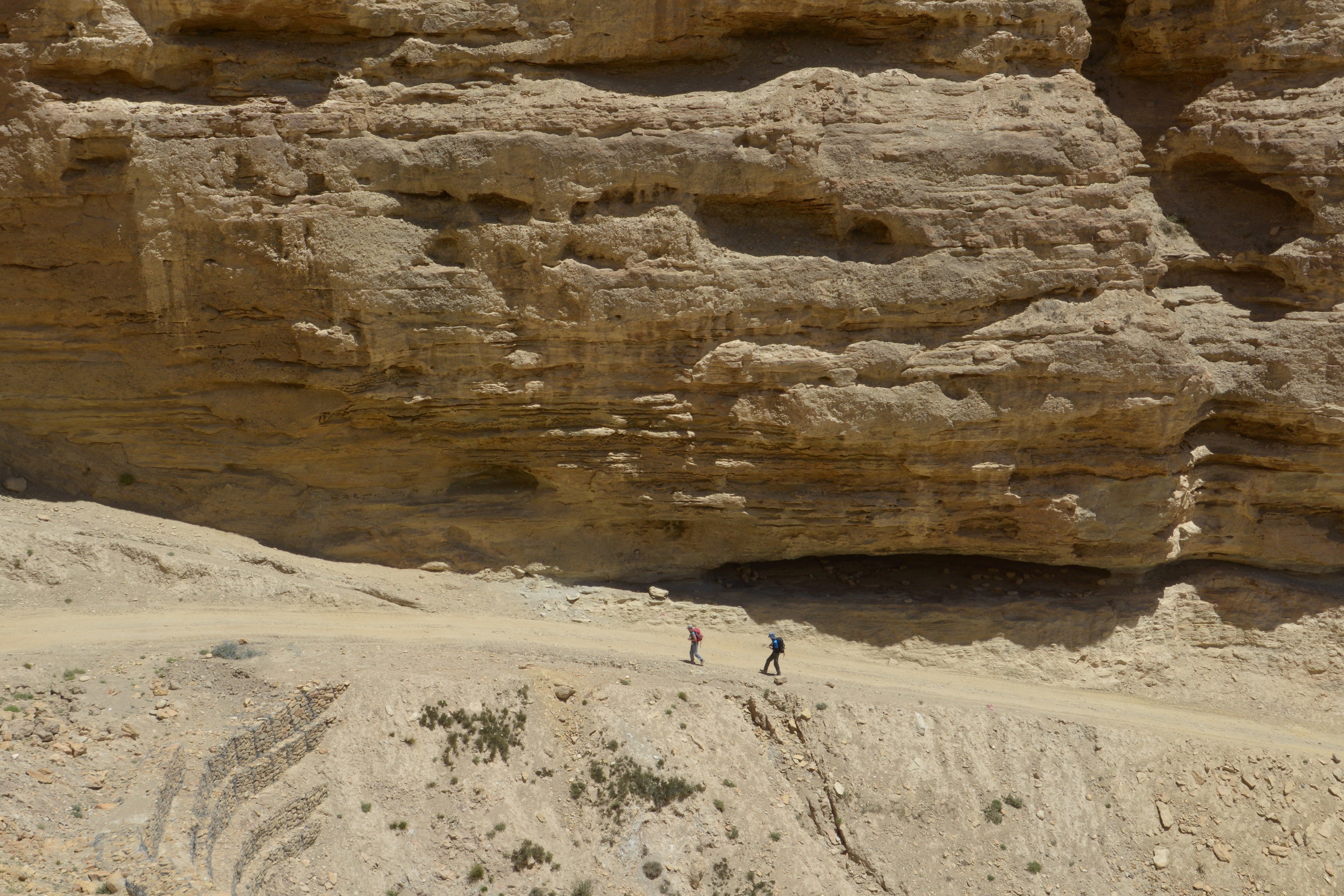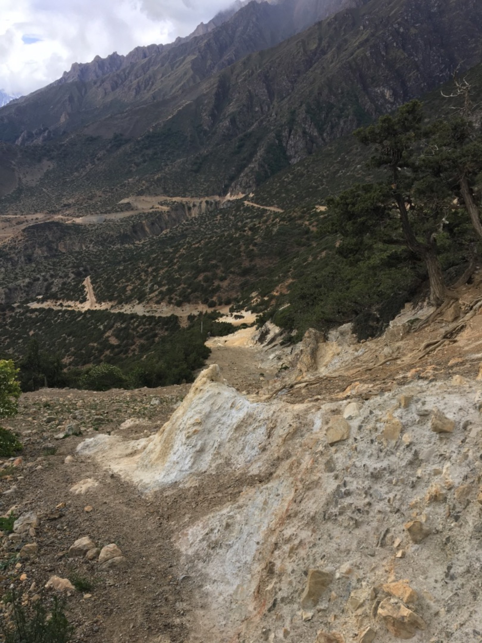 The loose rock climb up to Chaile. Looking down at Kali Gandaki halfway up the slope, you can see how the water is concentrating to the left of the pictures(just follow the dark grey). You can also see the river bed is very wide although the actual water courseway is little. Wonder how it looks when there is a lot more water flowing.