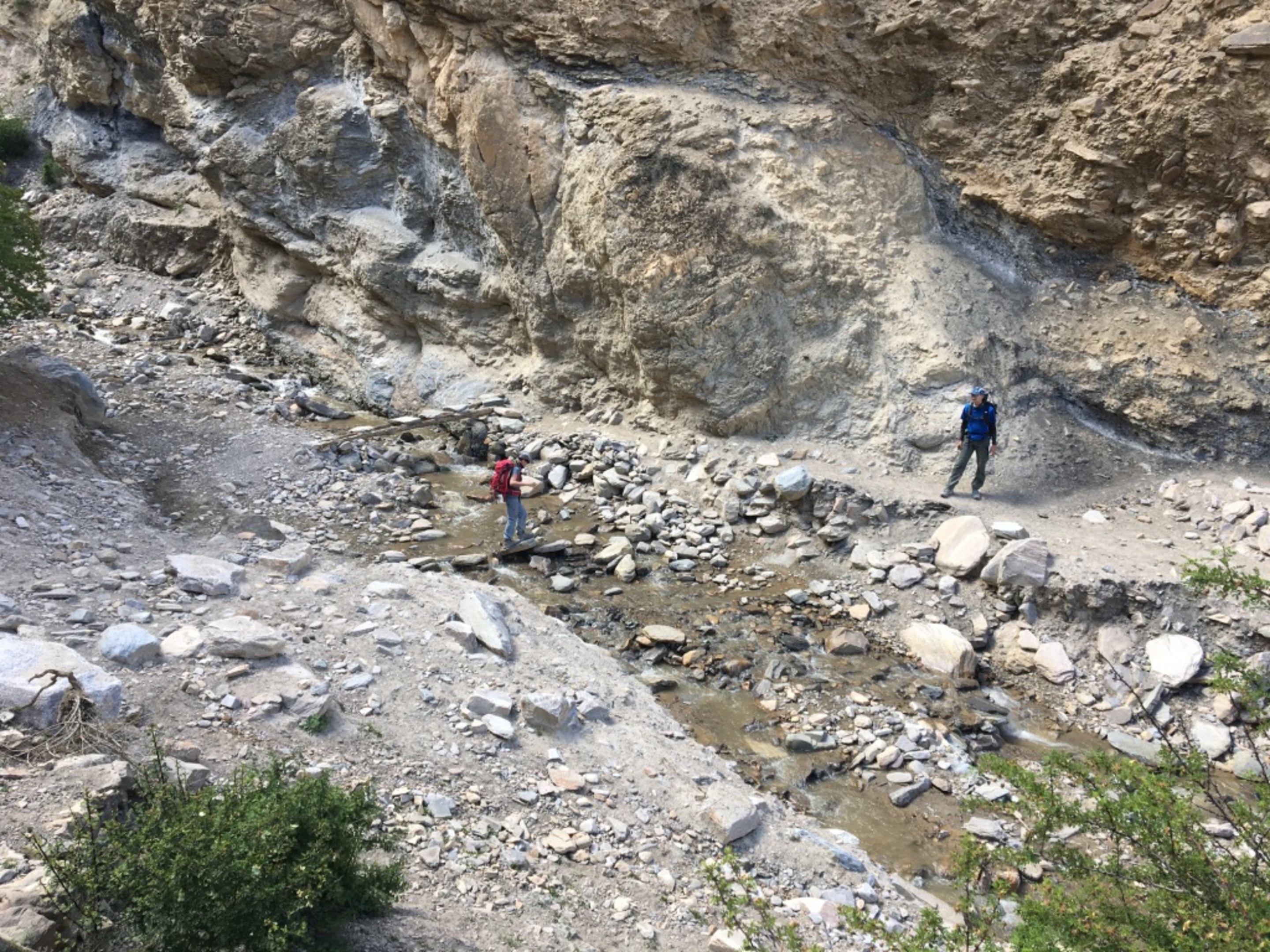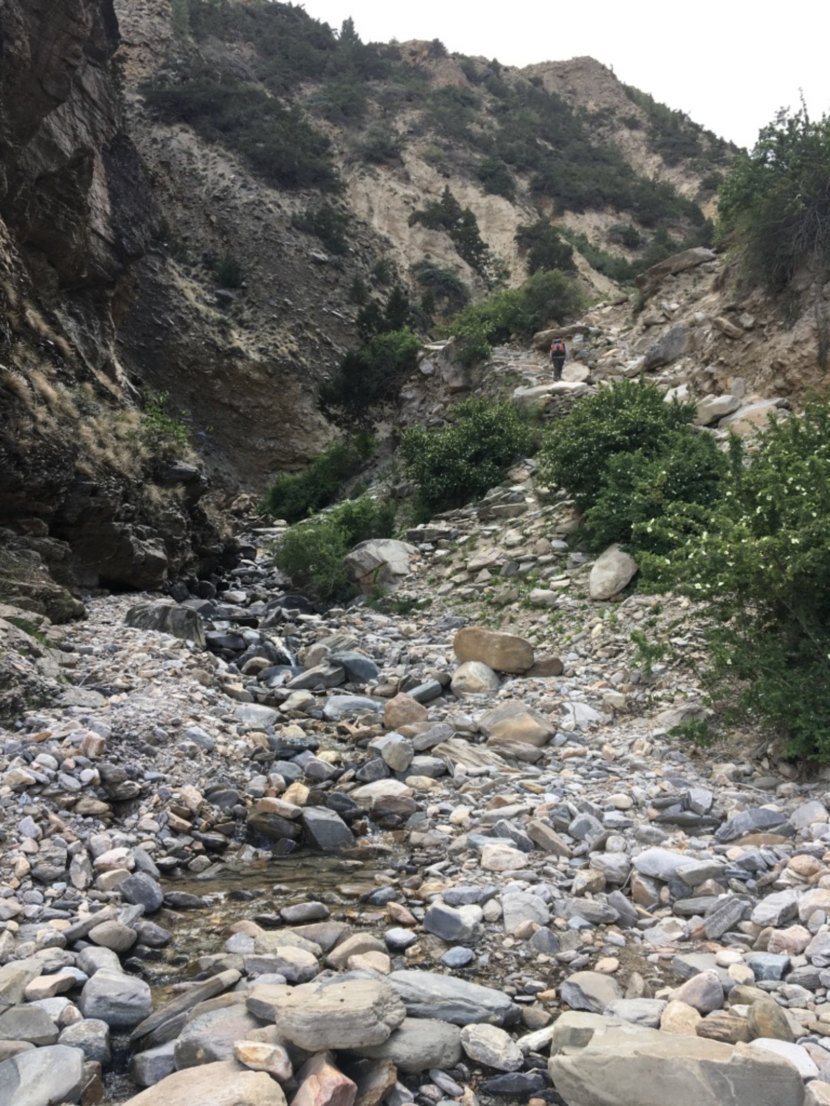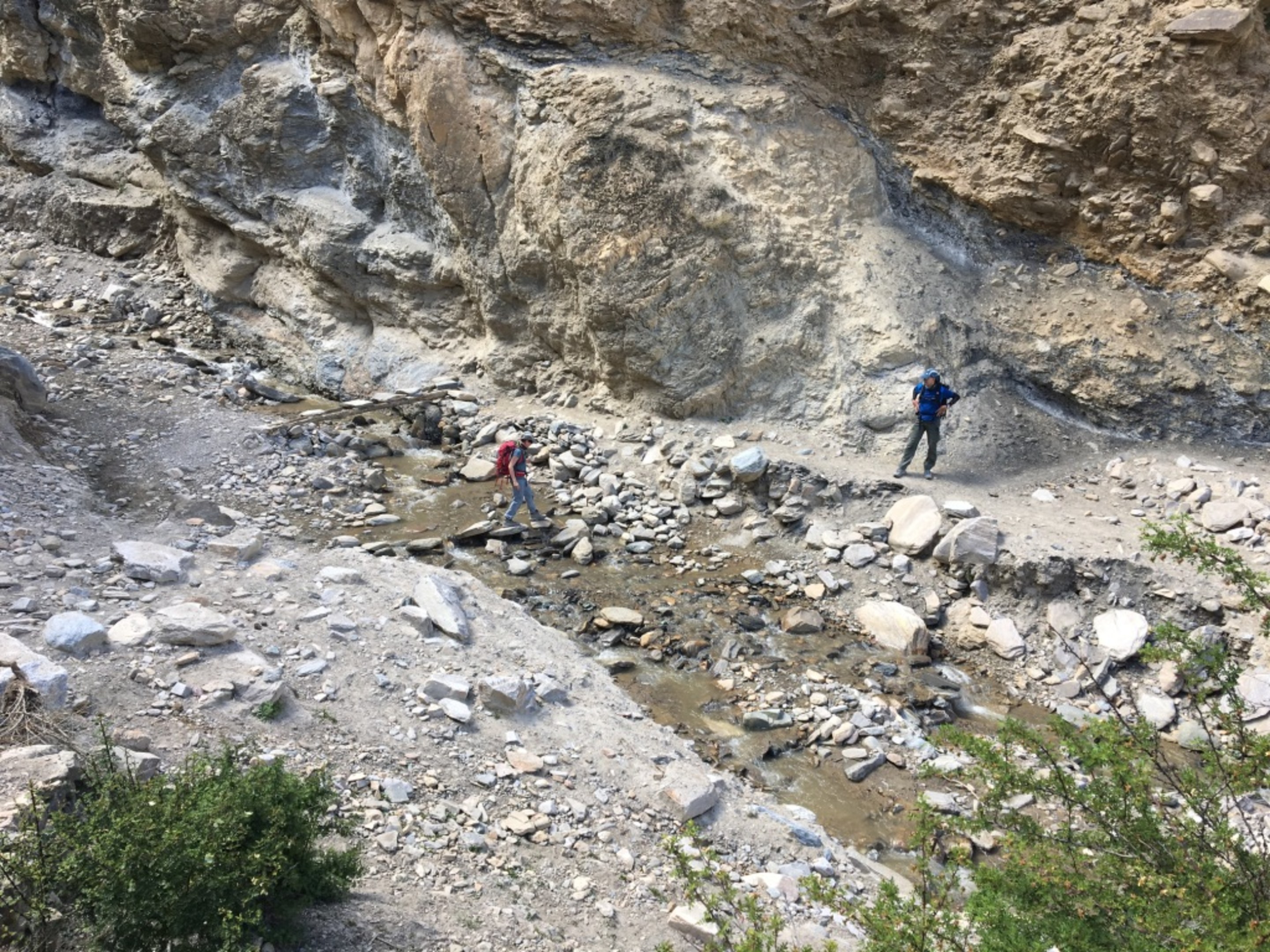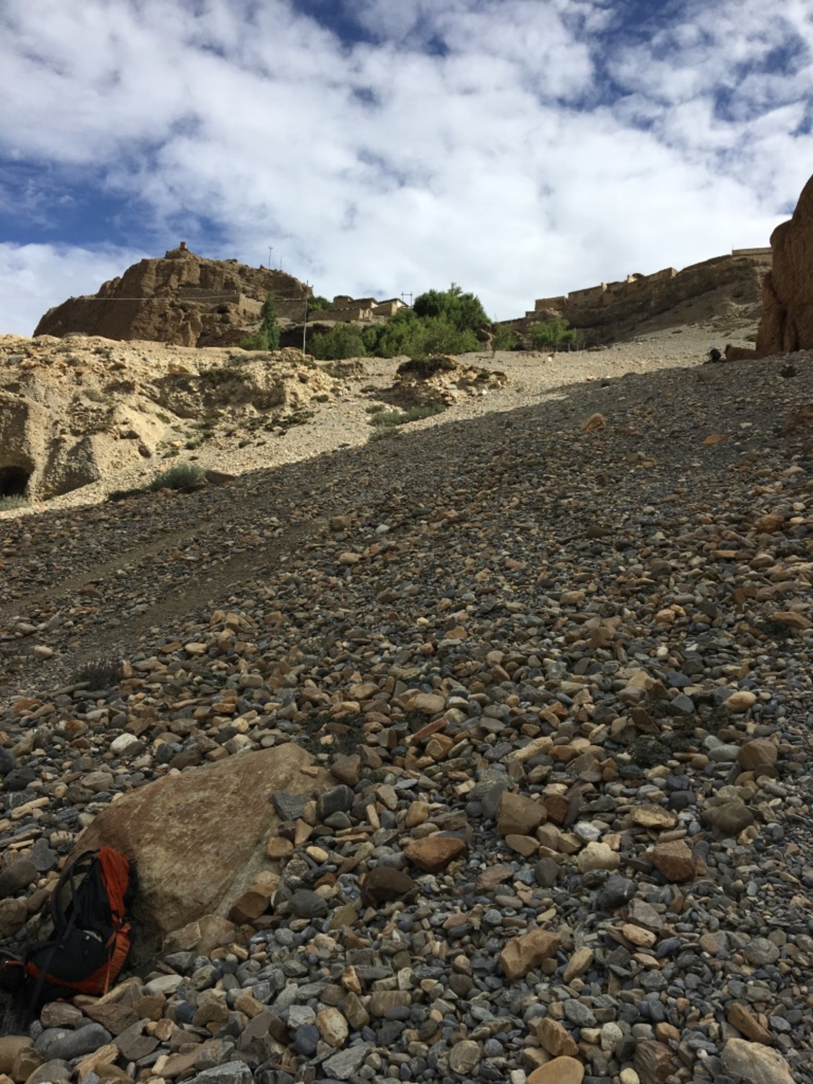 The loose rock climb up to Chaile. Looking down at Kali Gandaki halfway up the slope, you can see how the water is concentrating to the left of the pictures(just follow the dark grey). You can also see the river bed is very wide although the actual water courseway is little. Wonder how it looks when there is a lot more water flowing.